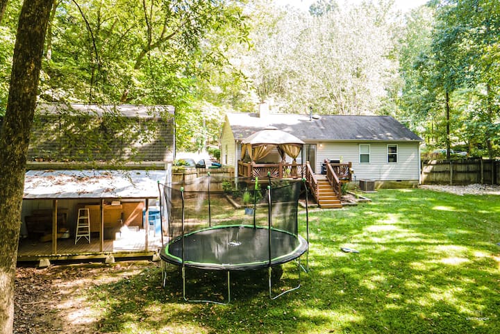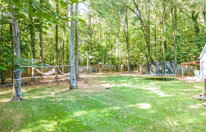 Outside, the fenced-in backyard features a trampoline, swing set, volleyball, fire pit, soccer goal, hammocks, and a grill on the large deck with seating under the gazebo.